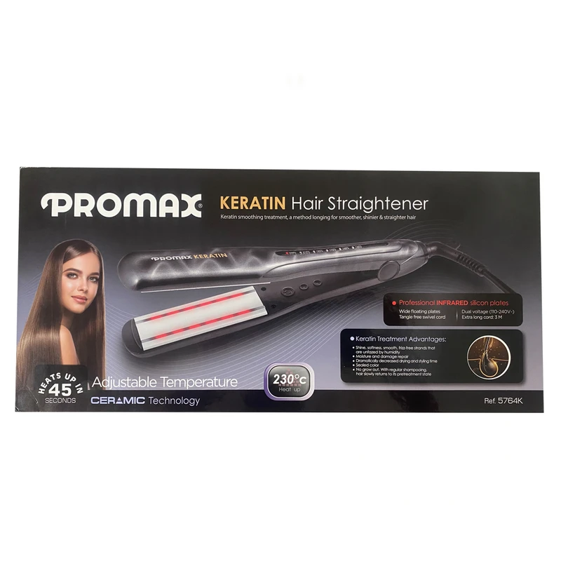 اتو مو پرومکس promax مدل 5764K یک اتوی پیشرفته است که برای صافکردن موها با کیفیت بالا طراحی شده است؛ صفحات آن از ترکیب سرامیک و کراتین ساخته شدهاند و امکان تنظیم دما بین ۱۳۰ تا ۲۳۰ درجه سانتیگراد دارد.
